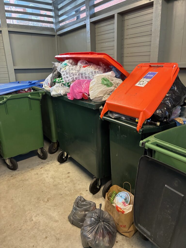 I eftermiddag kommer styrelsen för att för hand tömma ut kärlen, så att de kan stängas samt lägga överflödet i plastsäckar bredvid. Det är i dessa säckar som ni får slänga plasten tills imorgon alternativt att ni slänger plast igen imorgon kväll.